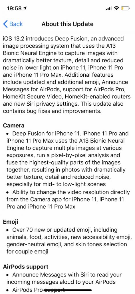 Cel mai important lucru adus de iOS 13.2 este Deep Fusion pentru noile aparate iPhone și suportul pentru noul sert AirPods Pro, tocmai anunțat de Apple. Totodată iOS 13.2 vne cu suportul pentru noul set Unicode 12 pentru emoji, cu mai mult de 230 de caractere. O grămadă de poze noi pentru animale, mâncare și alte chestii pe care internauții nu știu cum să le scrie și le vor folosi în comunicarea cu prietenii.
