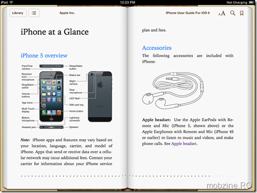 Din iBook utilizatorii de iOS pot descărca gratuit ghidul de utilizare pentru versiunea 6 a sistemului de operare mobil făcut de Apple. Prezentarea e împărțită pe 153 de pagini și poate fi accesată atât de pe smartphone cât și de pe tabletă. Tot ce e nevoie este instalarea de iBook.