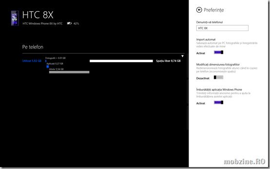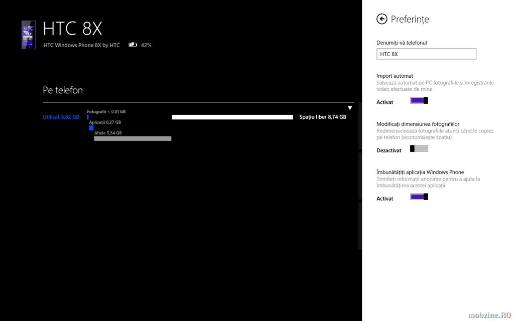 Aplicația oferă aceleași elemente pe care utilizatorii de Windows Phone le cunosc deja din Zune, adică opțiunea de sincronizare de poze, filme, muzică și instalarea de aplicații. Totuși, noul modul de sincronizare are o arie mai limitată de acoperire pentru că nu mai permite accesul și la setările legate de update și sincronizare WiFi dintre Windows Phone 8 și Windows 8, așa cum erau ele pe vechiul client Zune.