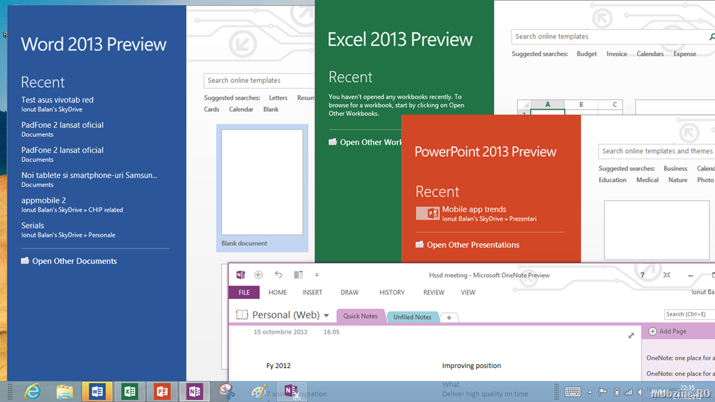 7. Office RT (15) vine preinstalat. Toate tabletele cu Windows RT vor avea suita Office RT preinstalată. Cuprinde Word, Excel, PowerPoint, OneNote în versiuni similare cu cele de pe PC. Lipsește Outlook. Trebuie să știți că documentele Office pe care le creați/folosiți pe PC vor putea fi accesate și manevrate de pe Offie RT via Windows RT.