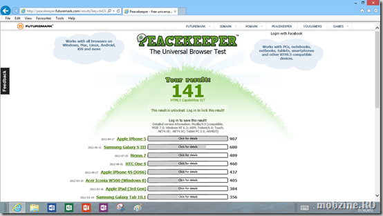 Deocamdată în Windows Store nu sunt aplicații de benchmark care să permită o comparație cu un desktop. Singura variantă pe care am aut-o la îndemână a fost să rulez testul Peacekeeper. Rezultatul poate fi văzut mai jos: