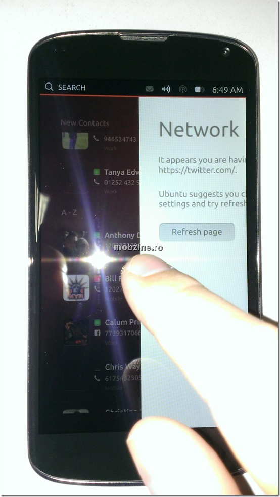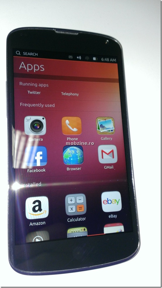 Am preferat să nu citesc înainte nimic despre cum se foloseşte interfaţa Ubuntu for Phones şi să încerc să îmi dau seama singur de funcţionalitate. În mai puţin de 10 minute ştiam toate operaţiile de bază: swype de la stânga la dreapta ascunde aplicaţia curentă. Swype de la dreapta la stânga aduce pe ecran aplicaţiile active din memorie – apropo de asta, pe măsură ce sunt lansate aplicaţii, într-o zonă specială de pe ecranul principal apar thumbnail-urile lor şi pot fi relansate mai simplu.