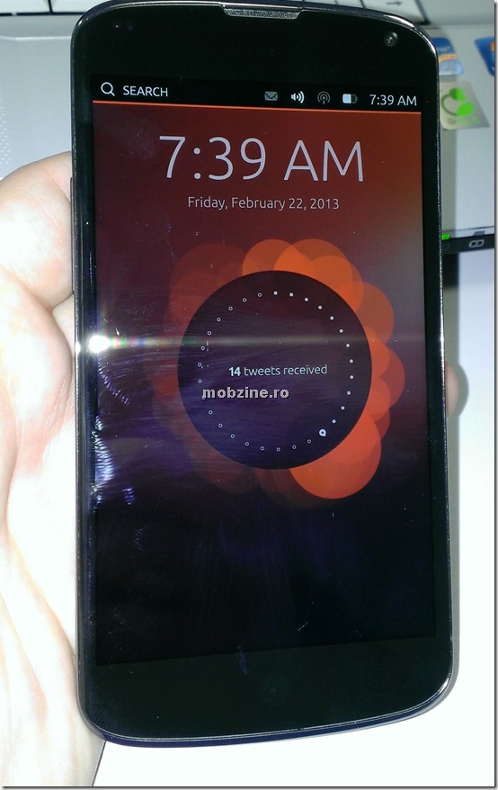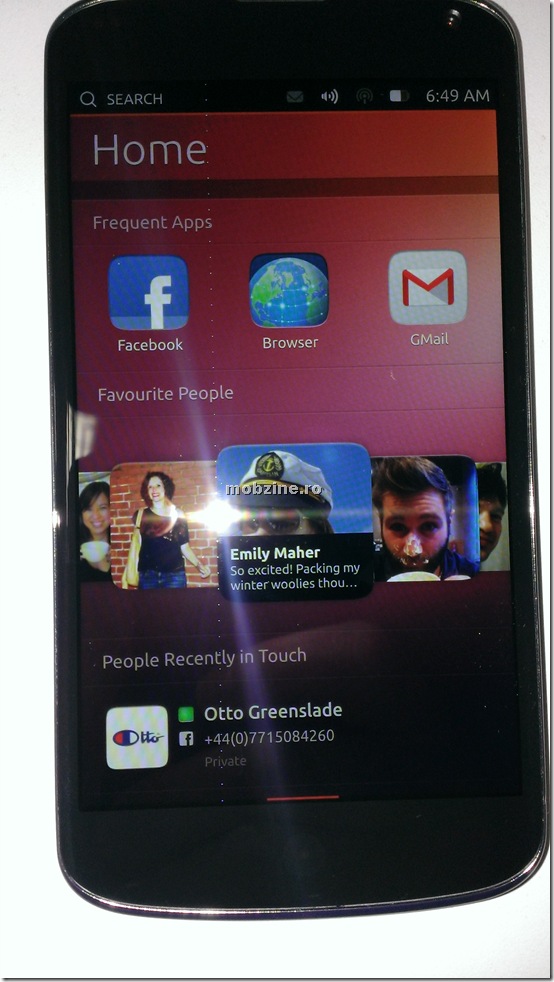Build-ul preview de Ubuntu for Phones arată o structură similară cu interfaţa Ubuntu pe desktop şi multe similarităţi cu Android şi multe elemente de navigare împrumutate parcă din MeeGo.