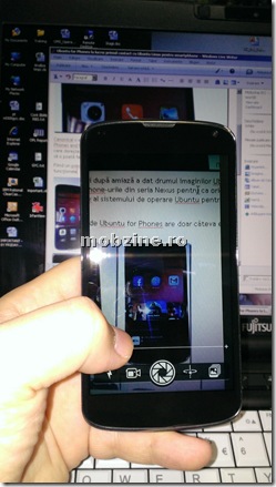 După cum spuneam, camera foto e funcţională: se lansează destul de repede modulul. Deocamdată nu sunt prea multe opţiuni în afara celor de focalizare, zoom şi înregistrare. Focalizarea se face la fel ca pe Android, iOS sau Windows Phone prin apăsarea pe zona dorită.