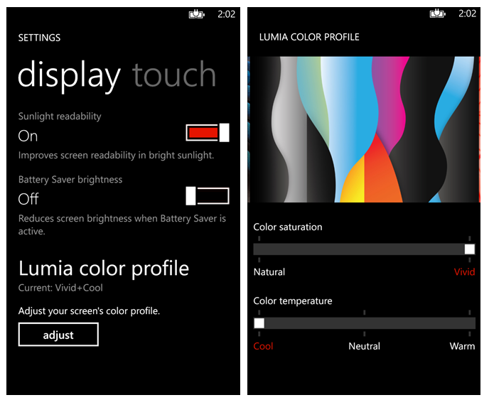EPână acum nu mai există nicio altă aplicație care să știe să acceseze setările sistemului de operare Windows Phone și să schimbe intensitatea culorilor. Opțiunile sunt în cadrul intrării ”display + touch” din settings.