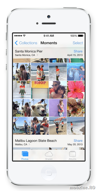 Modulul camerei foto are acum o nouă interfață și filtre. Organizarea de tip Moments: adică agregarea de poze pe bază de locație și timp sună foarte similar cu funcția adusă deja de HTC pe modelul One. Recunoașterea de gesturi e implementată și aici, preview-ul funcționând rapid. Mai există și opțiunile de partajare via iCloud.