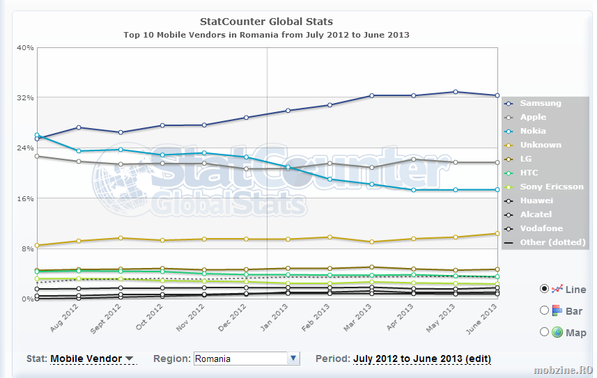Samsung începe să scadă în popularitate, Apple replică situația de la nivel mondial în timp ce Nokia pare să se fi stabilizat.