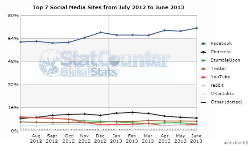 În afară de creșterea aproape permanentă a utilizării Facebook nu sunt prea multe de zis. A doua rețea de socializare din top este Pinterest, în scădere. Twitter pare că și-a păstrat oarecum fanii.