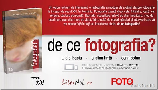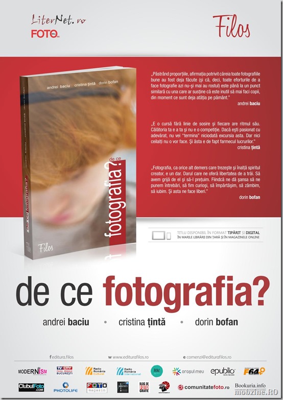 Editura Filos lansează vineri, 2 august 2013, ora 19:00, la Librăria Predania (str. Vulturilor nr. 8, sector 3, București), cartea „De ce fotografia?”. Autorii – Andrei Baciu, Cristina Țintă și Dorin Bofan – au realizat un proiect editorial extrem de interesant, o radiografie a modului de a gândi despre fotografie la început de secol XXI, în România. Fotografia văzută drept cale, întâlnire, joacă, vis, refugiu, căutare personală, libertate, necesitate, arhivă de stări interioare, mod de exprimare sau chiar mod de viață, într-o suită de eseuri, gânduri și interviuri care vă vor aduce față în față cu întrebarea cheie: de ce fotografia?