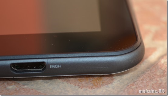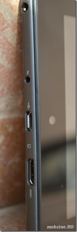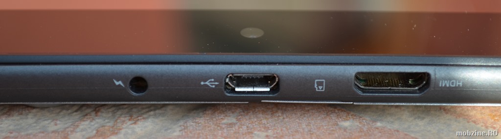 Pe laterale găsim fantele pentru conectori – jack audio, cablu HDMI, conectorul pentru cablul de alimentare (nu, Evolio Evotab HD nu poate fi încărcat direct prin USB), slot-ul microUSB pentru transfer de fișiere, cel microSD pentru card.