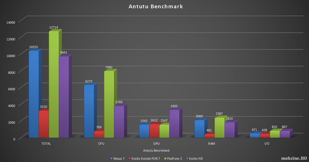 Antutu Benchmark, o suită de teste ce măsoară separat subsistemele aparatului ne arată un Evotab HD destul de apropiat de Nexus 7 în termeni de performanță.