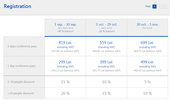 Notaţi data şi grăbiţi-vă să faceţi înregistrarea pentru că până la 30 septembrie sunt nişte preţuri foarte bune: 419 LEI pentru cele două zile sau 299 LEI pentru una singură. După preţurile cresc destul de mult. Aici e inclusă taxa de participare şi masa servită în regim catering.
