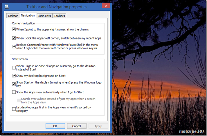 Utilizatorii nemulțumiți de introducerea opțiunii de boot-are direct în ecranu principal, cu Live Tile-uri, au acum facilitatea de a opta pentru deschiderea Windows-ului 8.1 direct în desktop-ul clasic. Se face prin clic dreapta pe taskbar și apoi Properties plus tab-ul Navigation. Bifați When I sign in or close apps on a screen, go to the desktop instead of start.