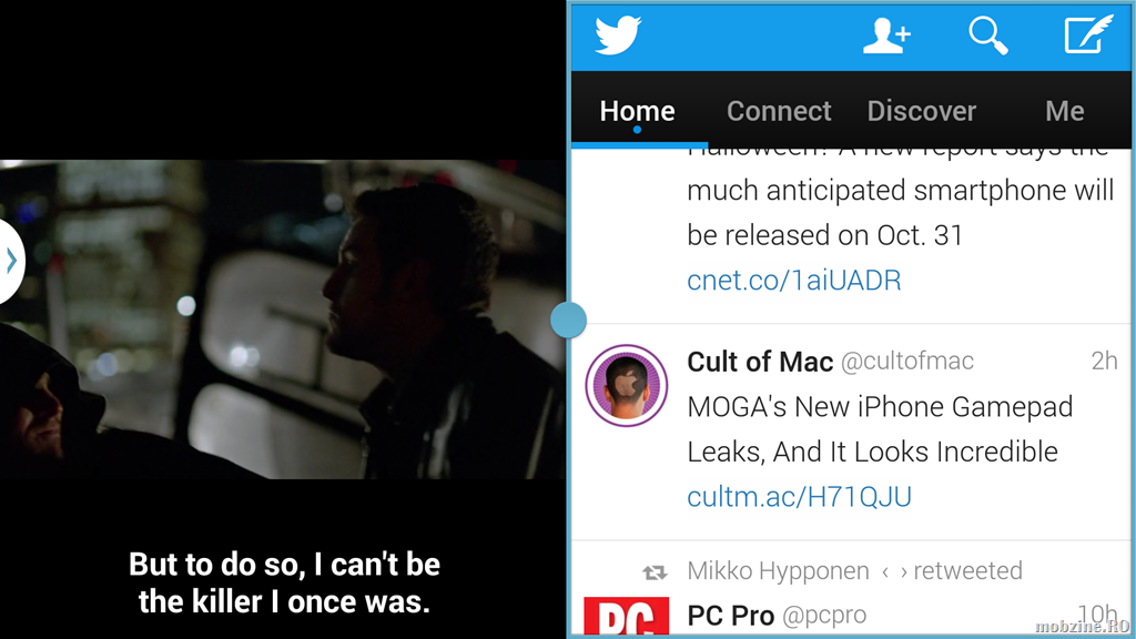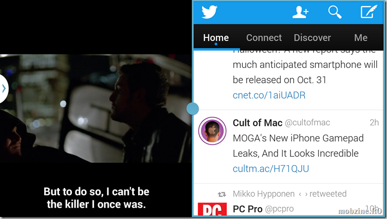 Mai introduc o funcție de care încep să nu mă mai despart: Multiwindow. Galaxy Note 3 poate să ruleze în paralel două ferestre pe ecranul phablet-ului. Utilizatorul poate să aleagă din meniul lateral stânga ce aplicație să mai fie adusă peste cea care rulează la momentul respectiv. Oferta e lagră, programele folosite cel mai des sunt prezente acolo. Eu aleg browser, player-ul video și Twitter plus email.