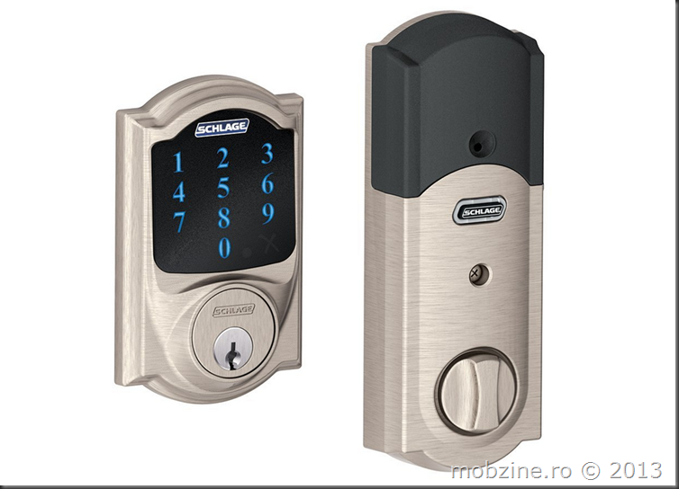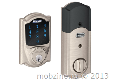 Peste el se poate aduce o încuietoare inteligentă pentru uși: Schlage BE469NXCAM619 Camelot Touchscreen Deadbolt with Nexia Home Intelligence and Alarm, Satin Nickel (Z-Wave) cu tot cu sistem de alarmă, la 185 USD.