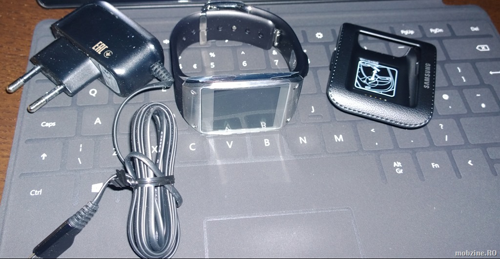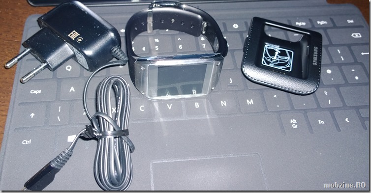 În cutia lui Samsung Galaxy Gear se găsește ceasul propriuzis, un suport pentru încărcare și încărcătprul. Merge tot pe microUSB. Nu există cablu microUSB pentru transferul datelor pentru că nu e nevoie de așa ceva – odată pornit și legat la Galaxy Note 3 prin Bluetooth și NFC e adusă din store pe phablet aplicația de management pentru Galaxy Gear și prin ea se fac setările ceasului și instalarea de aplicații.