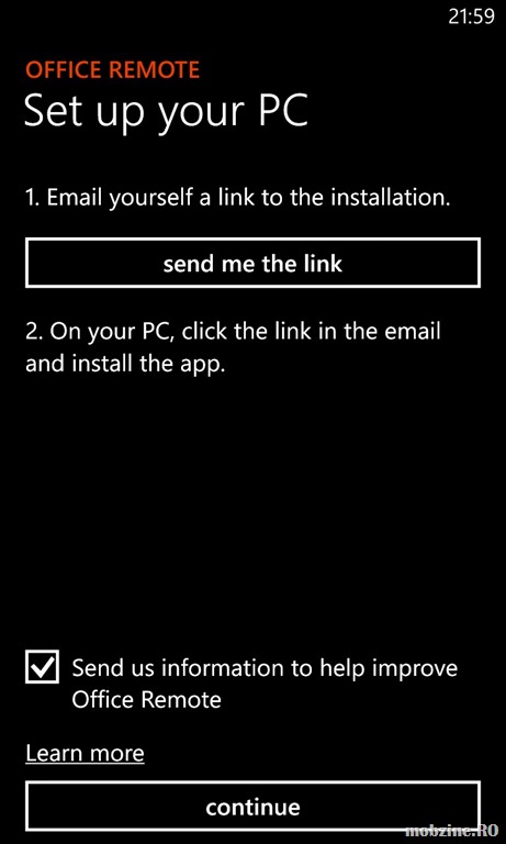 Lucrurile sunt simple: se instalează din Windows Phone Store aplicația Office Remote și se lansează pe telefon. În paralel trebuie instalată pe PC aplicația client – de pe un link ce va fi trimis din Office Remote de pe smartphone.