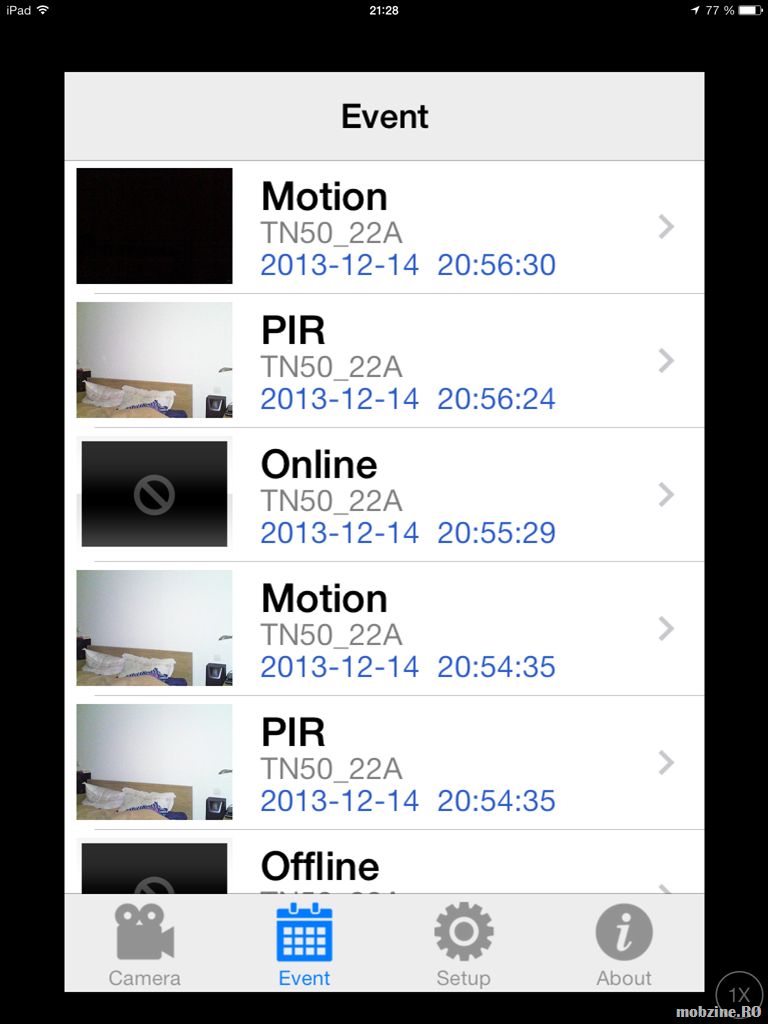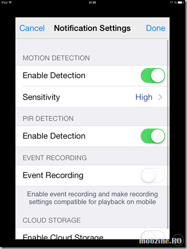 Treaba cu detecția mișcării e un lucru bun: se generează un eveniment care face ca informația captată să fie salvată undeva (local dacă există montat un microSD pe cameră, sau în cloud dacă e configurat contul Dropbox).