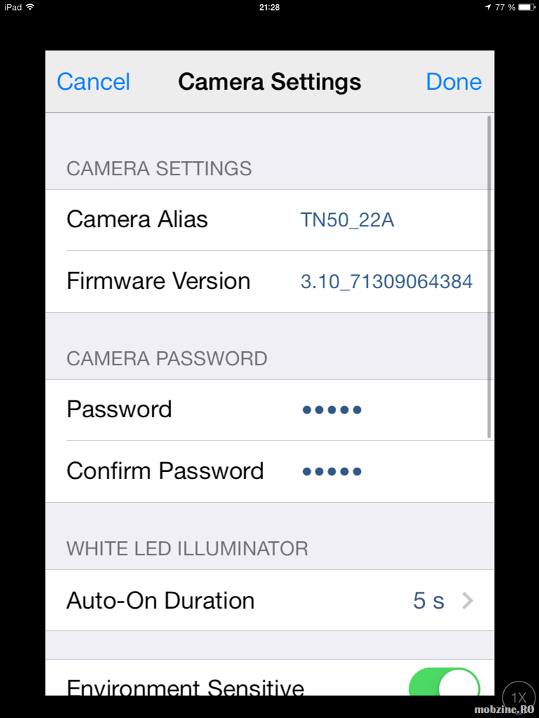 Dacă în schimb se apasă butonul Info ( i ) se intră în secțiunea de configurare unde setările disponibile sunt multe și detaliate. De la calitatea stream-ului audio/video, la opțiunile de activare pentru a facilității de detecție a mișcării, aprinderea automată a LED-ului (sau setarea unui orar în care e permisă aprinderea lui), salvarea în cloud (e necesară integrarea unui cont Dropbox) și update-ul de firmware (apropo de asta am făcut două sau trei update-uri în momentul în care am primit camera în teste).