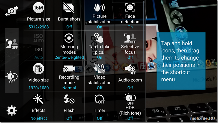 De curiozitate activați zona de setări pentru Camera de pe Galaxy S5. Veți vedea o selecție de opțiuni precum cea de mai jos, multe active altele nu. Va trebui să vă faceți puțin timp și să vă jucați cu diverse combinații pentru ca în final să ajungeți să faceți poze de calitate. Camera foto de pe Galaxy S5, creată pe baza unui senzor proprietar Samsung poate multe, eu nu am avut suficient timp cât să mă lămuresc ce și cum legat de fiecare facilitate în parte.