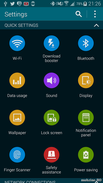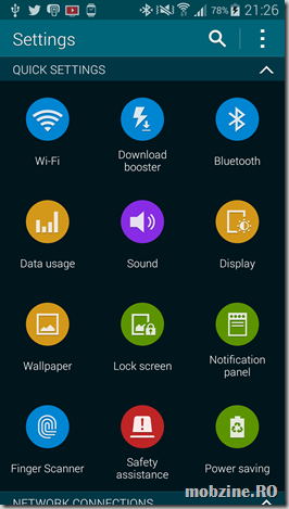 Și dacă tot a venit vorba, Galaxy S5 vine cu facilități de creștere a vitezei de download (Download booster) și mai multe moduri de conservare a energiei. Cel Ultra Power Saving trece display-ul într-un mod de lucru alb-negru, închide majoritatea funcțiilor de comunicare și blochează funcționarea aplicațiilor care nu sunt în lista celor admise. Teoretic, cu Ultra Power Saving mode autonomia este îmbunătățită dramatic: cu 78% baterie și fără acces la internet pe 3G sau WiFI, Ultar Power Saving permite atingerea unei durate de viață de aproape 10 zile. Aș fi vrut să testez facilitatea, timpul în care a fost la mine sample-ul Samsung nu mi-a permis să fac asta.