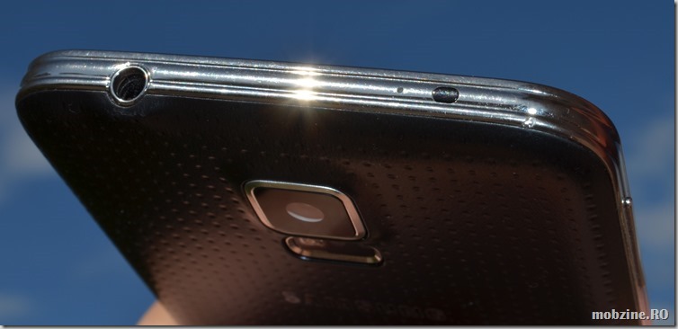 În zona superioară a carcasei lui Galaxy S5 nu avem schimbări majore: slot-ul pentru jack-ul audio nu are ușiță de protecție, fanta pentru microfon e și ea vizibilă în bordura carcasei alături de fanta pentru senzorul IR – pe acolo comunică telefonul cu electrocasnicele pe care le vom putea administra direct de pe telefon.