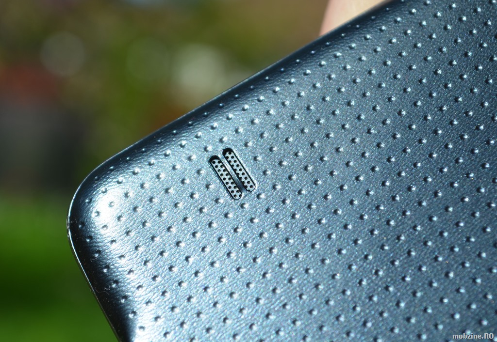 Difuzorul lui Galaxy S5 e pus în partea din spate, stânga, a capacului carcasei. După cum puteți vedea în imaginea de mai jos, deschizătura nu este foarte mare. Asta nu înseamnă că nivelul și calitatea sunetului generat de Galaxy S5 ar fi slabe, din contră, sună mult mai bine decât v-ați fi așteptat să rezoneze o carcasă de plastic!