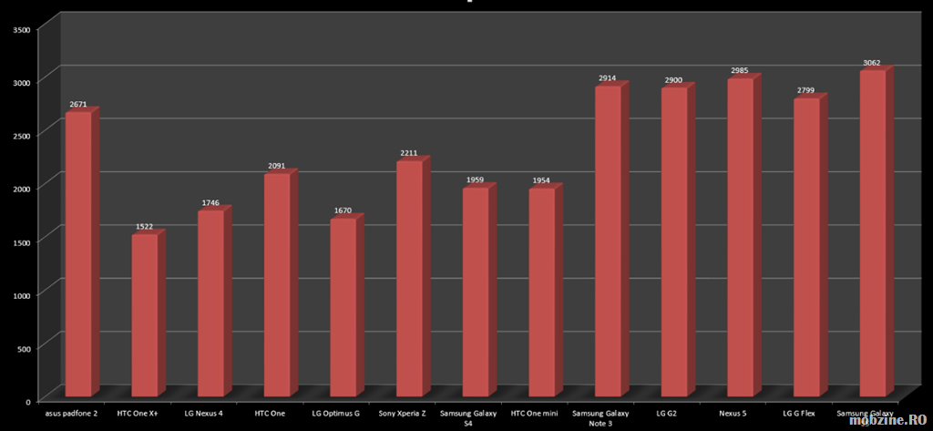 Primul test folosit este Benchmark. După cum puteți foarte ușor observa, Galaxy S5 are o performanță apropiată de LG G2, smartphone-ul pe care până acum l-am considerat cel mai rapid.