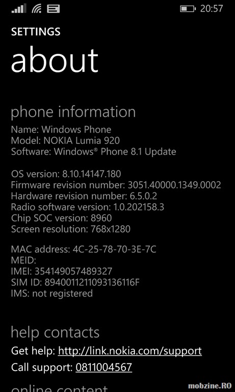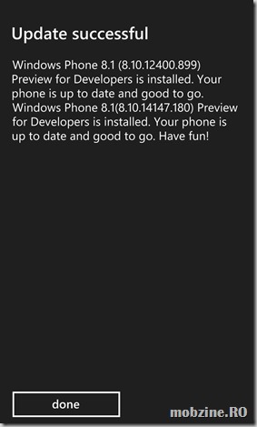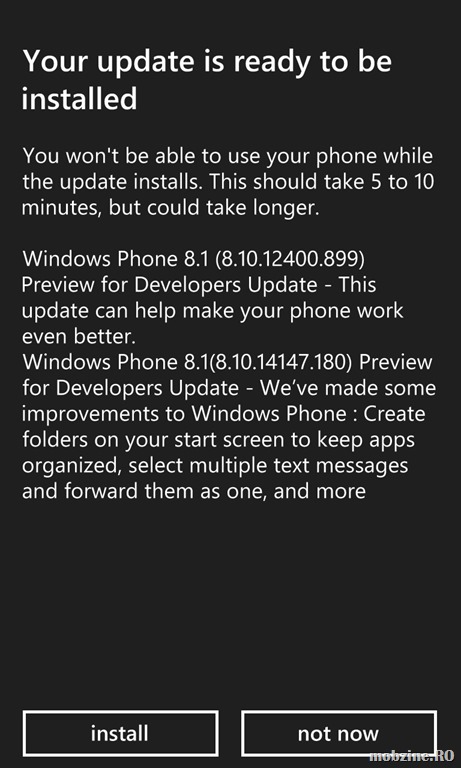 De astăzi de pe la ora 16:00 a României utilizatorii din programul Developer Preview pentru Windows Phone 8.1 au avut posibilitatea de a instala update-ul Windows Phone 8.1 Update 1, identificat cu 8.10.14147.180. L-am instalat fără niciun fel de probleme pe un Nokia Lumia 920 cu firmware-ul Black.