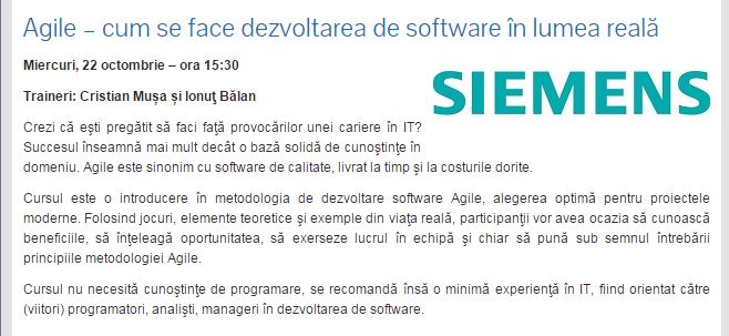 Astăzi, de la ora 15:30 în Aula Universităţii Braşov voi susţine împreună cu colegul meu Cristi Muşa o prezentare despre metologia Agile şi dezvoltarea de software în lumea reală. Prezentarea e deschisă tuturor studenţilor doritori şi e gratuită. Aşa că dacă sunteţi în zonă, haideţi să ne vedem şi să discutăm.
