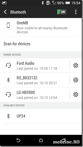 Din nou presupun că ați pornit conexiunea Bluetooth pe căștile LG TONE INFINIM (LG HBS-900). Apoi intrați în meniul Android, Settings și apoi Bluetooth din Wireless and Networks. Porniți conexiunea Bluetooth și așteptați să apară identificatorul LG HBS900.
