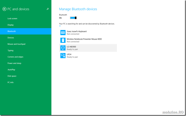 Intrați în PC Settings, apoi PC and devices și de acolo alegeți Bluetooth. Presupun că driver-ul pentru cip-ul Bluetooth e instalat corect și sistemul funcționează.