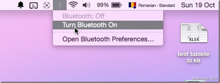 În primă fază deschideți conexiunea Bluetooth: din icon-ul din bara de meniu alegeți Turn Bluetooth On.