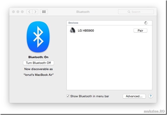 Conectarea căștilor LG TONE INFINIM (LG HBS-900) pe Mac OS X Yosemite e la fel de simplă ca cea pe Windows, explicată mai sus. Din nou presupun că driver-ul pentru Bluetooth e înstalat și configurat corect iar căștile au pornită conexiunea Bluetooth.