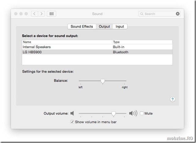 În ultimă instanță, deschideți Sound din setările Mac OS X și verificați dacă pe Output sunt selectate căștile LG HBS900. Acum sunetul va putea fi trimis în căști.