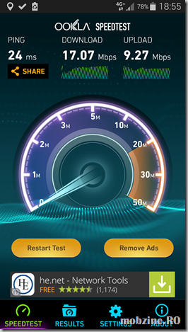 3) Uneori e mai indicat să se treacă pe 4G decât pe 4G+ pentru o viteză mai bună. Când semnalul 4G+ nu e suficient de puternic, e mai bine să se treacă pe 4G și așa să se obțină o viteză mai bună de transfer. Treaba asta e valabilă pentru orice operator și atunci când pe 4G nu e semnal suficient. Ca să am cât de cât un reper în ceea ce înseamnă viteza am folosit serviciul SpeedTest care nu e nici pe departe cea mai exactă măsurătoare.