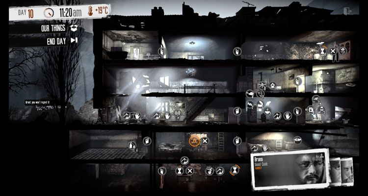 Când începi aventura ta sumbră în This War of Mine, ți se vor da trei personaje, selectate din două grupuri. Posibil să fie mai mult de două, dar în mod consecvent doar două grupuri mi-au picat. Pe de o parte era Bruno, bucătarul, prezent în ambele grupuri, de cinci ori la rând, așa că prespun că el vine ca default.. Pe de alta, Pavle și Katia, fotbalist și reporteră. Iar în final erau Roman și Arica, soldat și hoață. Al doilea grup are un nivel de dificultate considerabil mai mare, chiar dacă nu este evident la început. Ca să explic. Întreaga premiză a jocului este că acești trei oameni vor transforma treptat o clădire bombardată în culcușul lor, unde să fie în siguranță.