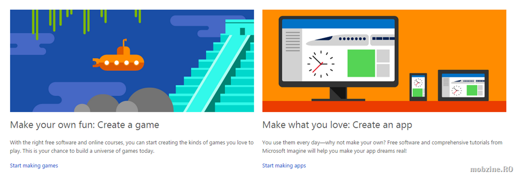 Pentru toți cei ce visează să creeze aplicații și jocuri, programul Imagine e un foarte bun punct de pornire, locul în care se pot găsi instrumentele, tutorialele și o grămadă de documente care să ajută punerea în practică a ideilor. Sunt accesibile și resursele din proiectele Kodu Game Lab, Project Spark și TouchDevelop, aflate deja în derulare.
