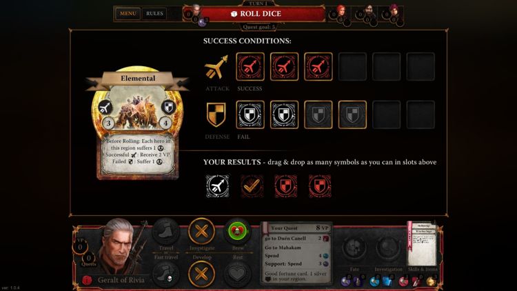 Când începi un meci vei putea alege dintre patru personaje: Geralt, Triss, Dandelion și Yarpen. Tot nu știu cu siguranță cine este Yarpen. Plus câteva alte lucruri, cum ar fi durata sesiunii, de o misiune, trei sau cinci și durata unei ture. Mă bucur că au adăugat asta, pentru că jocul va da afară automat jucătorii ce nu sunt activi un minut, trei minute sau cinci minute. Cine alege durata de timp cea mai mică va „câștiga”, determinând durata meciului. Când începi, ești într-un colț din hartă, mereu același în funcție de personaj, și trebuie să alegi o misiune din două.