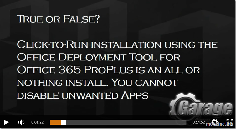 Pe Channel 9, sub inițiativa Microsoft Garage, Curtis Sawin arată cele mai noi elemente de administrare din ale Office 365 ProPlus și Click-to-Run. Veți vedea cât de simplu este să se facă instalări personalizate ale suitei Office, fără anumite pachete, specificate de admin.