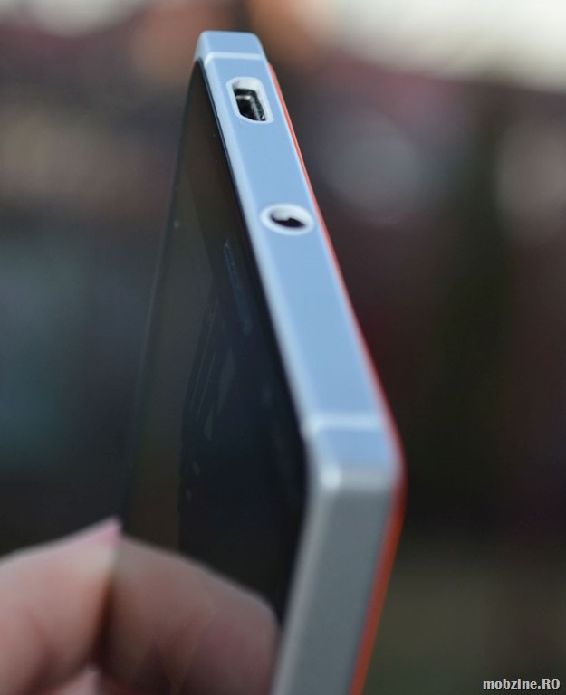 În ceea ce priveşte conectica, atât slot-ul pentru cablul microUSB cât şi cel pentru jack-ul audio sunt poziţionate pe marginea superioară, ceea ce nu e neapărat un lucru rău – se poate folosi aparatul şi când e pus la încărcat.