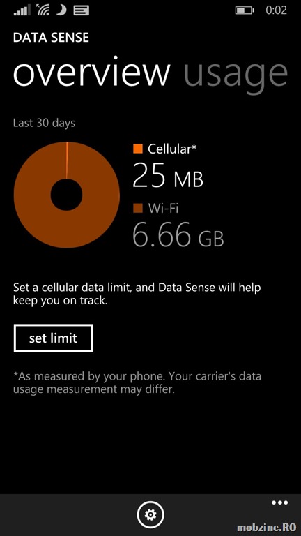 Cu Windows Phone 8.1 există şi un modul dedicat – Data Sense – ce monitorizează consumul de date şi poate să intervină automat şi să limiteze traficul de date atunci când ne apropiem de expirarea celui programat în abonament. Se poate urmări foarte uşor şi care sunt aplicaţiile cele mai consumatoare de date.
