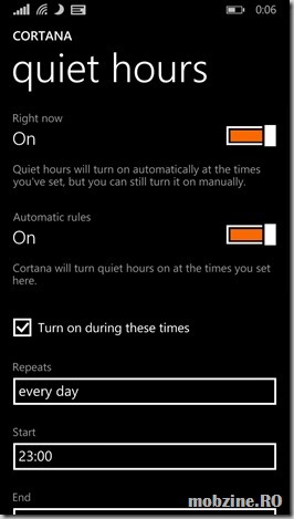 Sau poate vă interesează să activaţi Cortana şi elementele quiet hours: intră automat restricţii legate de trafic şi nivelul de sunet.