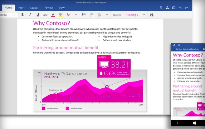 Primele versiuni de Microsoft Word, PowerPoint si Excel optimizate pentru folosirea touch au fost lansate astăzi de către Microsoft în Windows Store. Ele sunt versiuni de test pentru următorul Office, făcute pentru Windows 10, după cum a spus Joe Belfiore, ele fac parte din suita Universal Apps, adică acele aplicații ce vor funcționa și pe Windows 10 pentru PC, tabletă și smartphone.