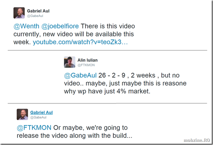 Cam asta e concluzia pe care o putem desprinde din mesajele de pe Twitter ale lui Gabriel Aul, cel ce conduce programul Windows Insider Preview de la Microsoft. După ce a răspuns la mai multe întrebări legate de versiunea de smartphone a lui Windows 10, Gabriel Aul a dat și detaliul cel mai așteptat: săptămâna aceasta, alături de un nou material video despre Windows 10 for phones va veni și build-ul de test.