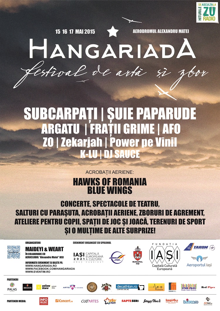 Dacă ești pasionat de activități aviatice, salturi cu parașuta, concerte, spectacole de teatru sau activități artistice neconvenționale, cu siguranță îți vom capta atenția când îți vom spune că singurul festival outdoor din România care îmbină arta nonconformistă cu pasiunea pentru zbor, Hangariada, se apropie. În weekend-ul 15 -17 Mai va avea loc a 5-a ediție a festivalului, la Iași, pe Aerodromul ”Alexandru Matei”.