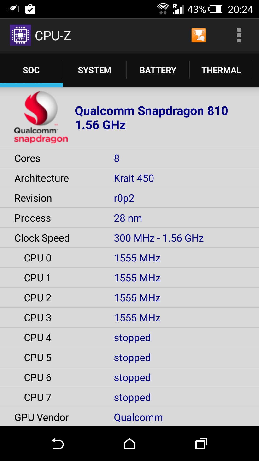 După cum se poate vedea din datele extrase din CPU-Z, modelul de One M9 pe care l-am folosit merge cu 8 core-uri la 1,56 GHz, din care patru sunt oprite.