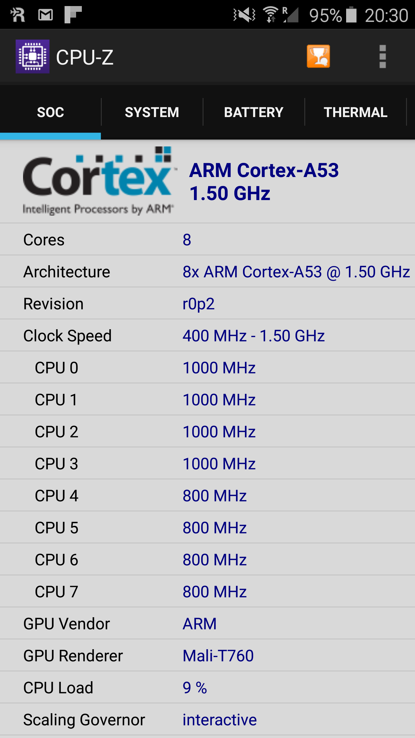 Din datele extrase de CPU-Z vedem că pentru sample-ul folosit avem 8 core-uri Cortex A53 la 1,5 GHz, toate active.