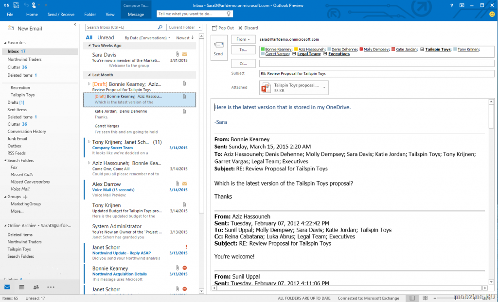 Pe scurt veți găsi integrarea elementelor de colaborare în toate aplicațiile din Office 2016, integrarea mai bună cu OneDrive, Clutter (serviciu Exchange integrat în Outlook)