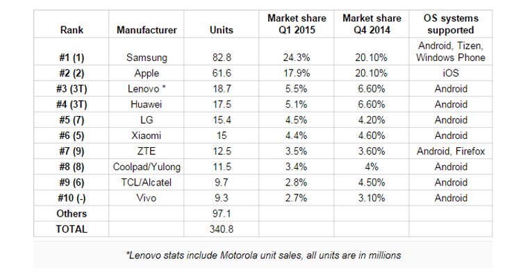 Dacă radiografia pieței de smartphone pentru primul trimestru al lui 2015, așa cum a reieșit ea din studiul celor de la TrendForce, nu v-a satisfăcut, poate că un nou set de cifre vă va fi mai pe plac. Chiar dacă deosebirile dintre cele două nu sunt foarte mari. De această dată vine să ne ofere situația actuală a producătorilor de smartphone Tomi Ahonen, un fost executiv al Nokia, despre care se spune că are un istoric foarte bun în a livra cifre corecte.